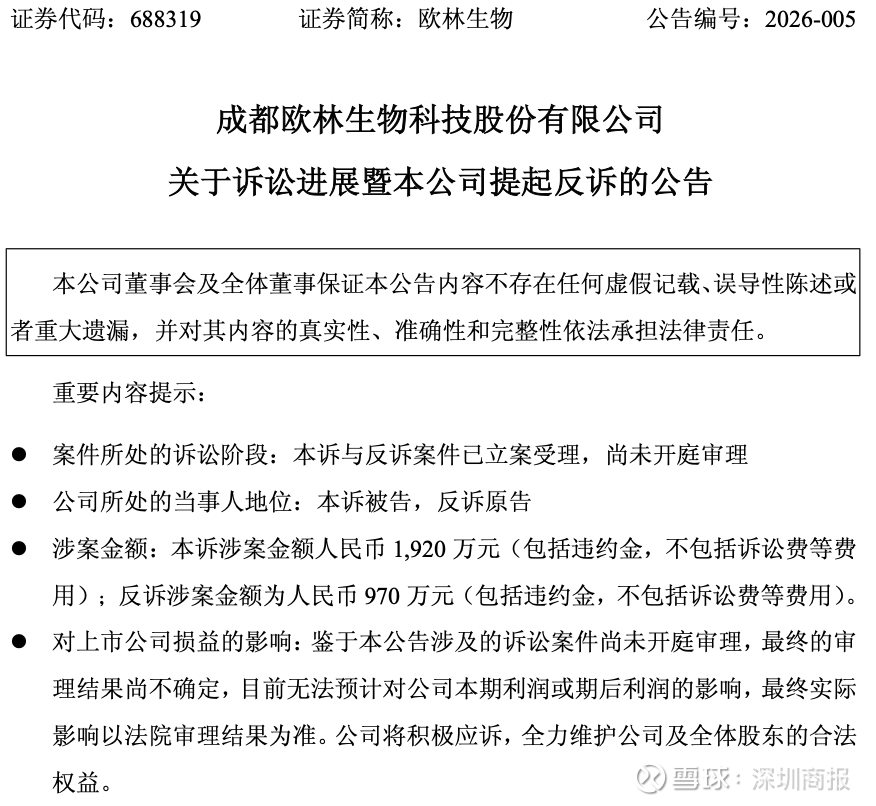 1月26日,欧林生物(688319)发布关于诉讼进展暨本公司提起反诉的公告。