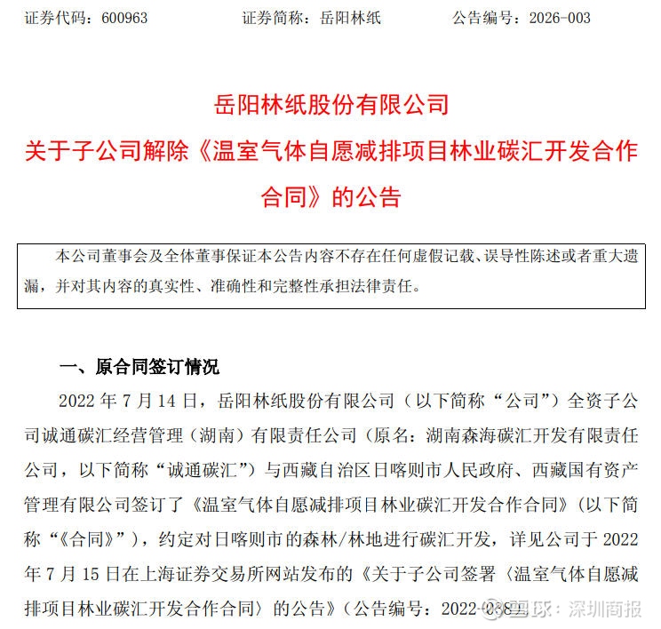 1月27日,岳阳林纸(600963)发布公告,子公司解除《温室气体自愿减排项目林业碳汇开发合作合同》。