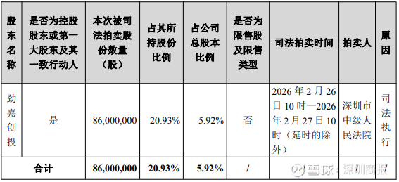 公告显示,劲嘉创投本次被司法拍卖股份数量为86,000,000股,占其所持股份比例为20.93%,占公司总股本比例为5.92%。司法拍卖时间为2026年2月26日10时—2026年2月27日10时。