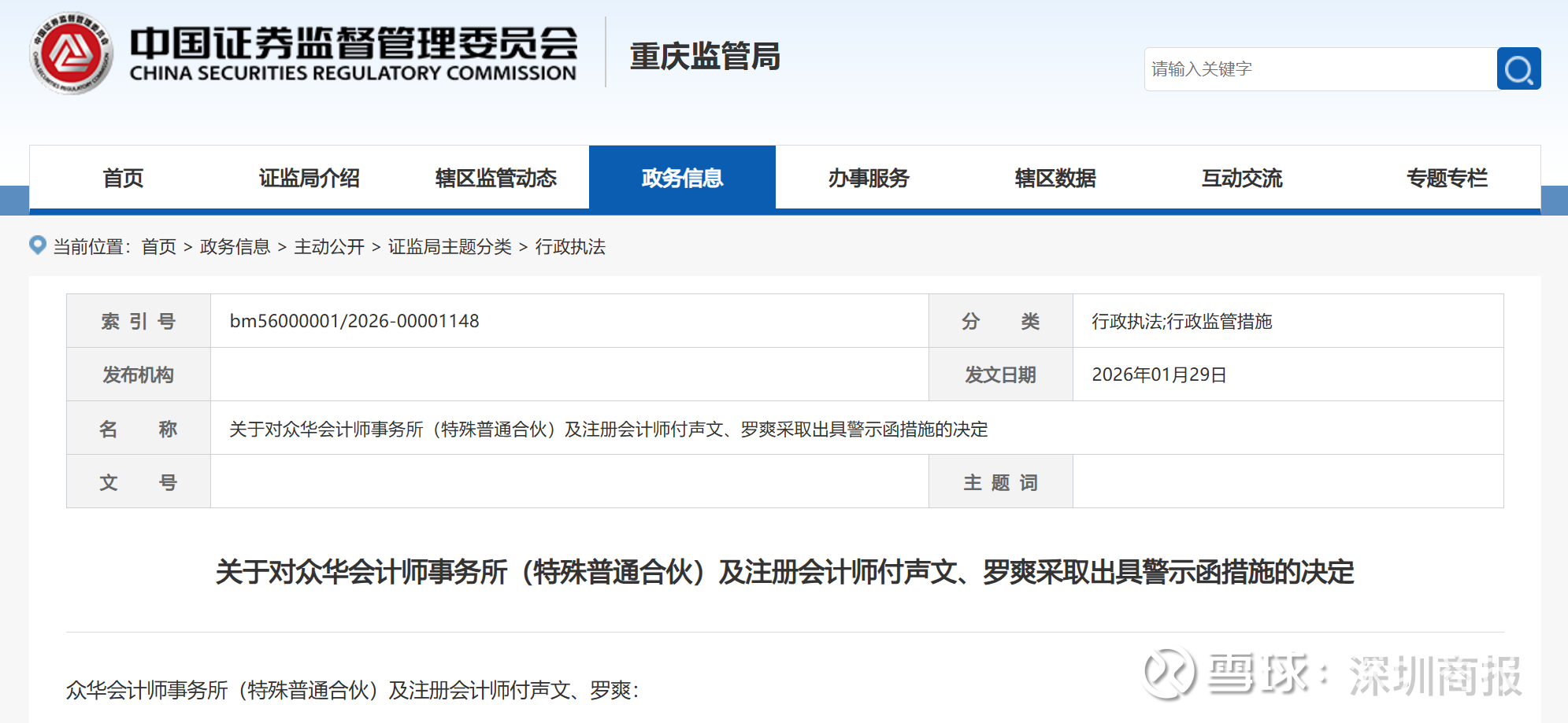 上述行为违反了《上市公司信息披露管理办法》(证监会令第182号,以下简称《信披办法》)第四十五条、第四十六条的相关规定。根据《信披办法》第五十五条的规定,重庆证监局决定对众华所及签字会计师付声文、罗爽采取出具警示函的行政监管措施,并记入证券期货市场诚信档案。你们应严格遵守《中国注册会计师审计准则》相关规定,进一步强化质量控制与复核,切实提高执业质量。