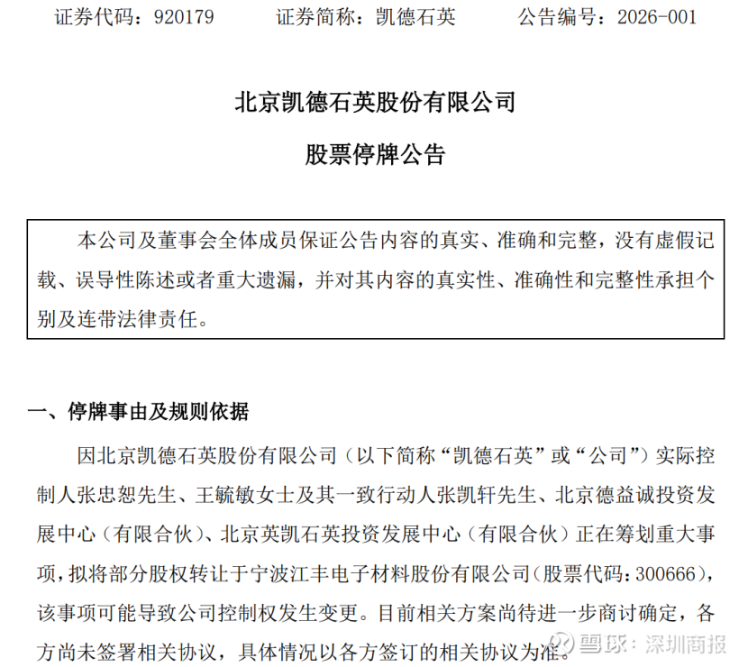 同日,凯德石英发布公告称,公司实际控制人张忠恕、王毓敏及其一致行动人张凯轩、北京德益诚投资发展中心(有限合伙)、北京英凯石英投资发展中心(有限合伙)正在筹划重大事项,拟将部分股权转让于宁波江丰电子材料股份有限公司,该事项可能导致公司控制权发生变更。