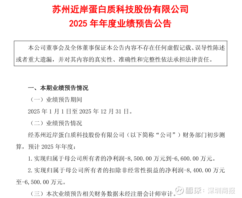 1月30日,近岸蛋白(688137)发布业绩预告,预计2025年度实现归属于母公司所有者的净利润亏损8500万元到6600万元,上年同期归属于母公司所有者的净利润亏损5441.63万元。