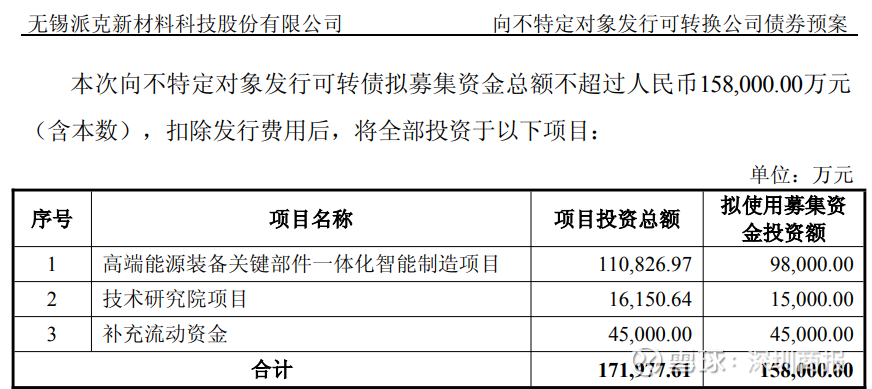 1月30日晚间,派克新材(605123)公告,公司于1月30日召开第四届董事会第七次会议,审议通过了《关于公司向不特定对象发行可转换公司债券预案的议案》及其他相关议案。公司拟发行总额不超过15.8亿元的可转债,其中9.8亿元将投向高端能源装备关键部件一体化智能制造项目。