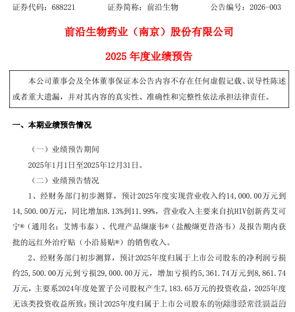 1月31日,前沿生物(688221)发布2025年度业绩预告,公司预计2025年归属于上市公司股东的净利润亏损2.55亿元至2.9亿元,较上年亏损幅度有所扩大。