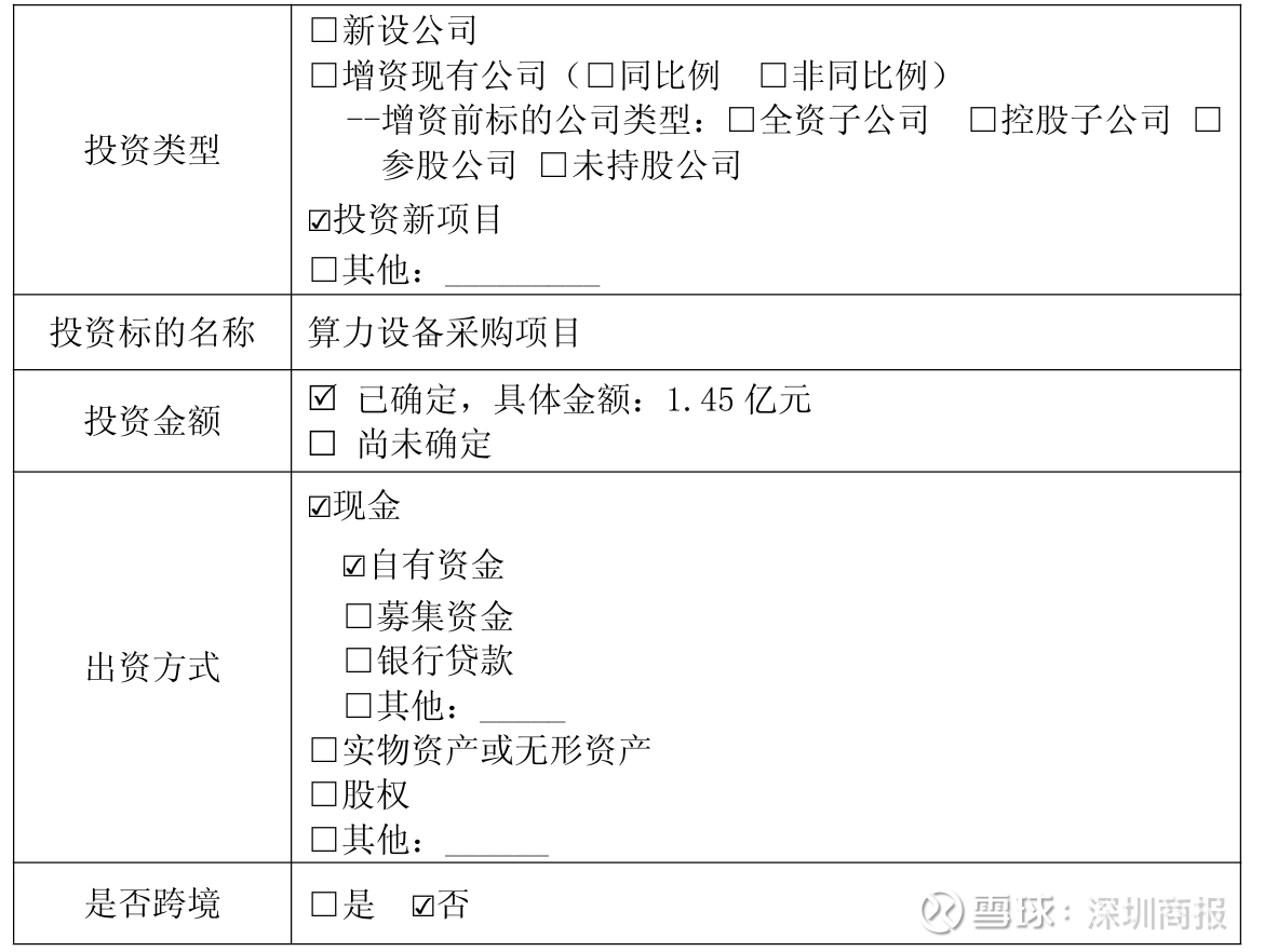 具体来看,深圳智算力拟投资购买算力设备包括服务器购置费约1.15亿元,组网设备及配件购置费约0.07亿元,集群配套设备租赁费约0.2亿元,流动资金约0.03亿元。深圳智算力出资建设项目,负责项目的建设与运营。深圳智算力是公司控股子公司,公司持股比99.925%。