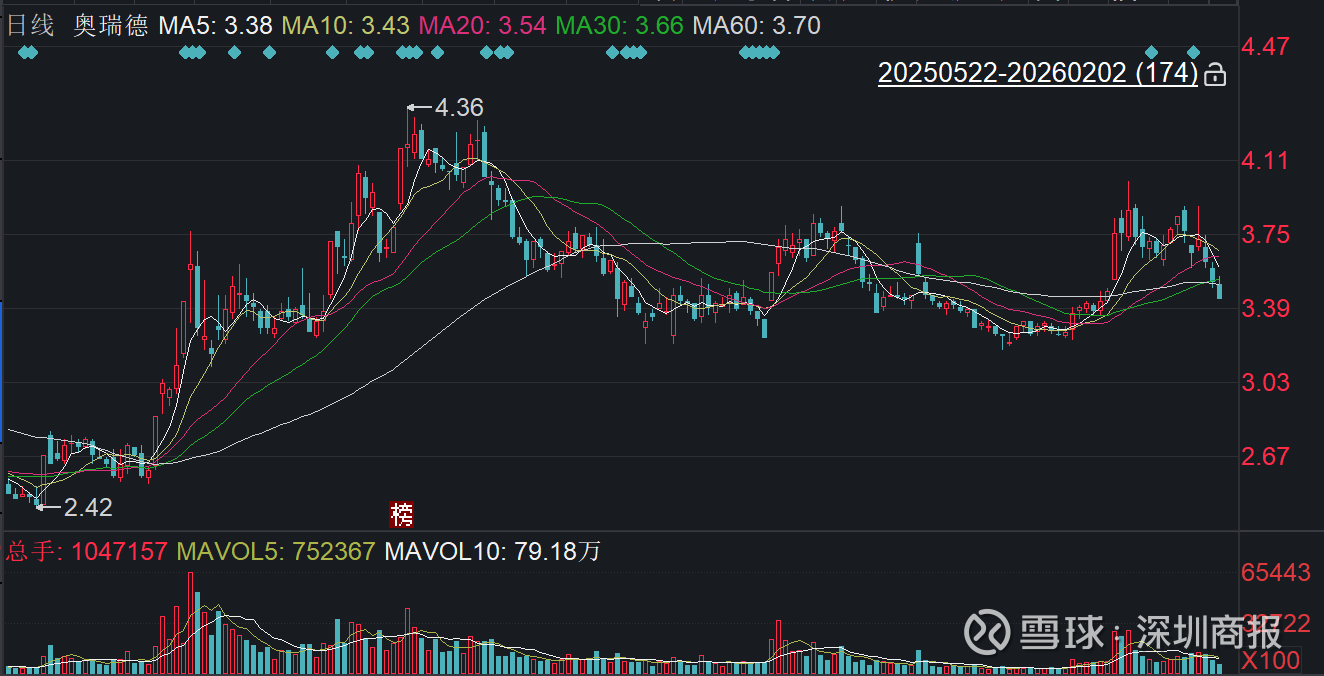 二级市场上,截至2月2日收盘,奥瑞德下跌2.28%报3.43元/股,总市值约94.37亿元,近一年来公司股价累计上涨约六成。