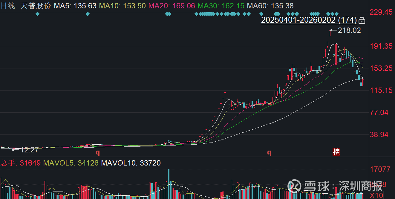 截至2月2日收盘,天普股份由2025年底218.02元/股的高位,回落至133.91元/股,但近一年累计上涨达933%。