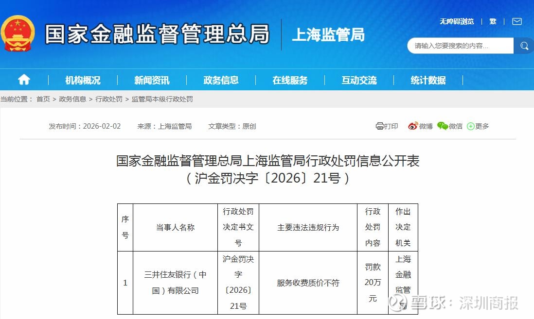 2月2日,国家金融监督管理总局上海监管局发布的行政处罚信息公开表显示,因服务收费质价不符,三井住友银行(中国)有限公司被处以罚款20万元。