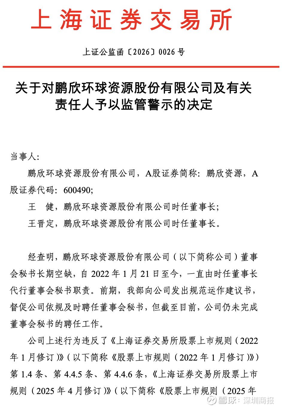根据上交所在2026年2月3日发布的公告,鹏欣资源(600490)及其时任董事长王健和王晋定收到了监管警示。