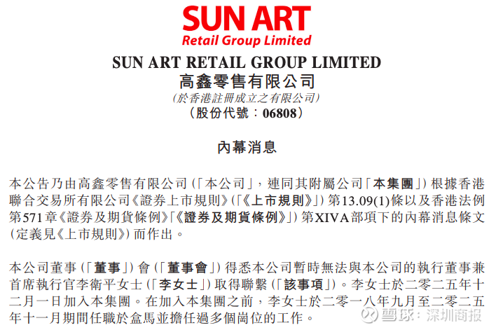 2月4日早间,大润发母公司高鑫零售(HK:06808)在港交所公告称,公司董事会得悉公司暂时无法与公司的执行董事兼首席执行官李卫平取得联系。