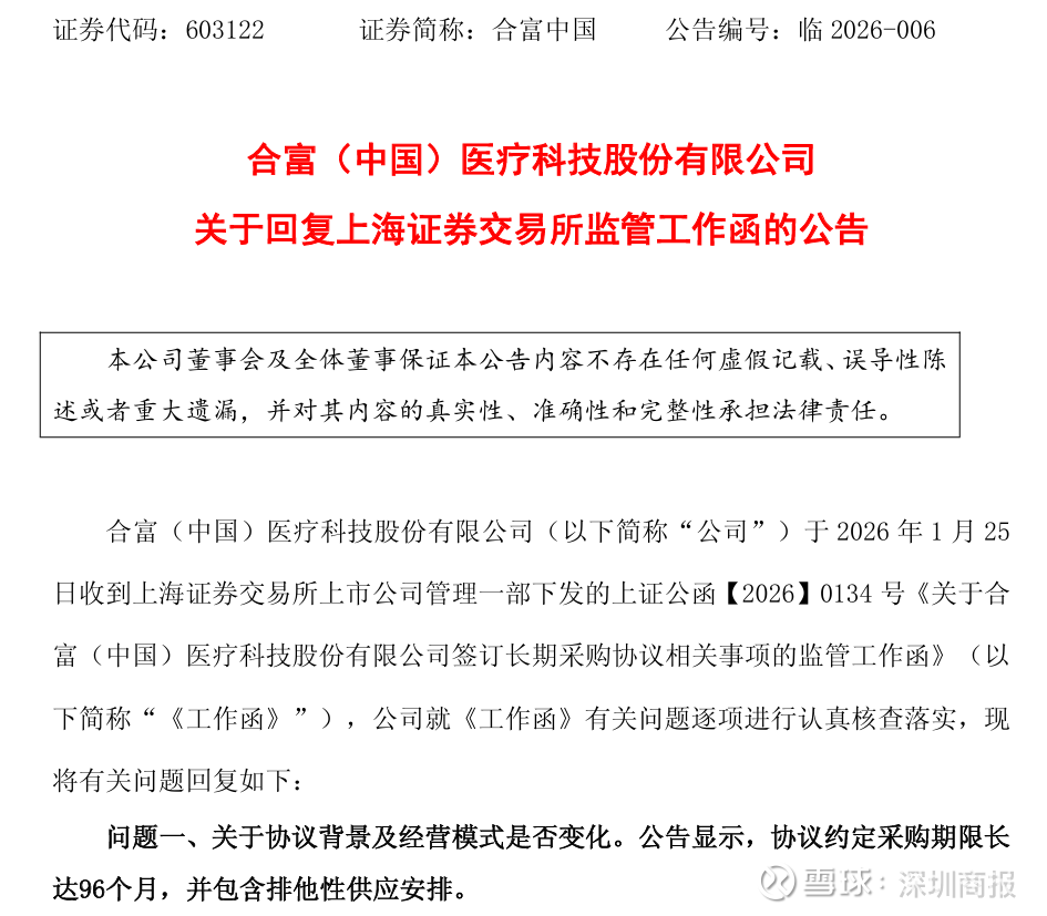 2月4日,合富中国(603122)发布公告,公司对2026年1月25日收到的上交所的监管工作函进行了回复。