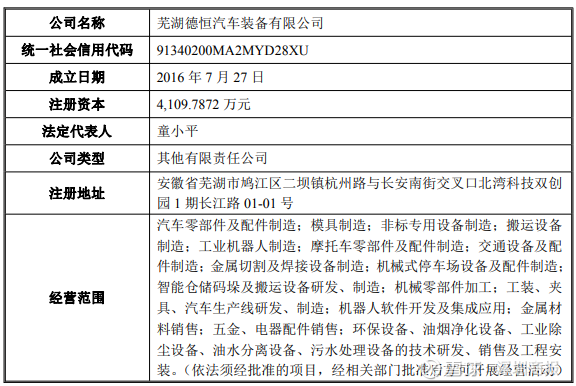 芜湖德恒成立于2016年7月27日,注册资本为4109.7872万元,法定代表人童小平,主营汽车零部件及配件制造、模具制造、非标专用设备制造、工业机器人制造等。公司有11位股东,其中,第一大股东童小平,持股比例25.6%,其次张亚鹏,持股比例22.02%。