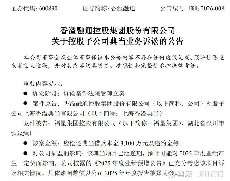 根据公告,香溢融通控股子公司上海香溢典当在1月份将福星集团等诉至上海市长宁区人民法院,要求判令福星集团偿还当金3100万元、判令福星集团支付截至2025年12月25日的违约金205.90万元和以3100万元为基数按照年利率24%计算,自2025年12月26日起至实际清偿之日的违约金。