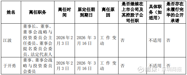截至本公告披露日,江波、于开勇未持有公司股份,不存在未履行完毕的公开承诺,并已按照公司相关规定做好工作交接。公司将尽快按照相关程序选举新任董事、董事长。