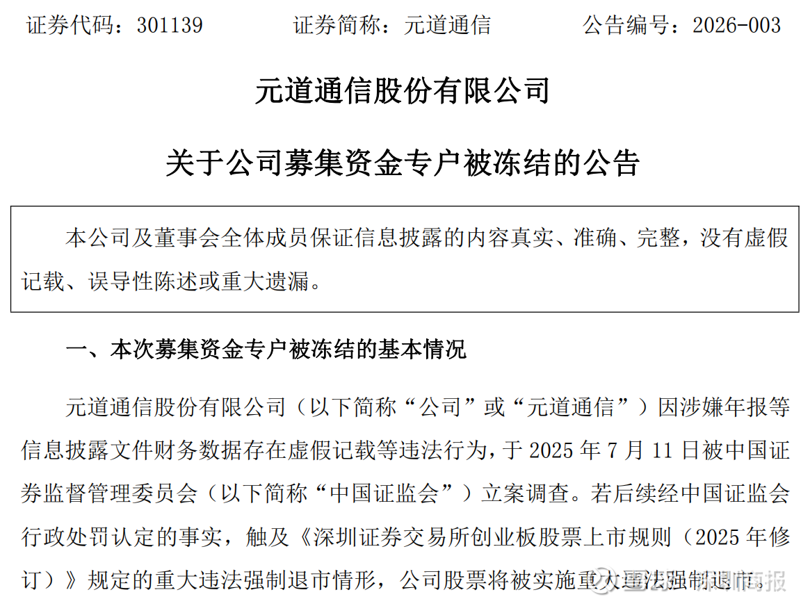 目前,元道通信已因涉嫌年报等信息披露文件财务数据虚假记载等违法行为,于2025年7月11日被中国证监会立案调查,后续若触及重大违法强制退市情形,公司股票将面临强制退市风险。