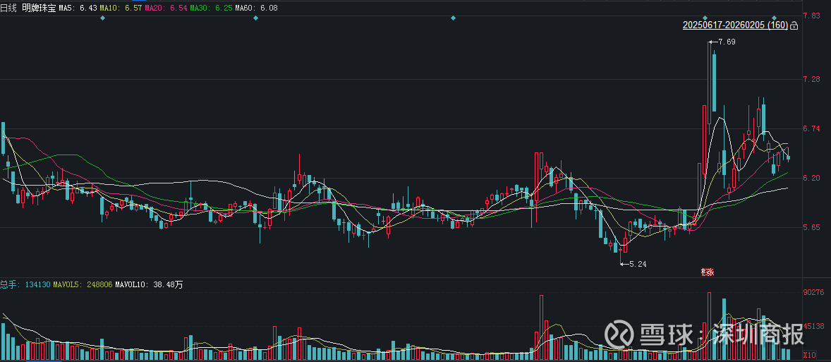 二级市场上,截至2月5日收盘,明牌珠宝下跌1.54%报6.39元/股,总市值约33.74亿元,近一年来公司股价累计上涨约四成。