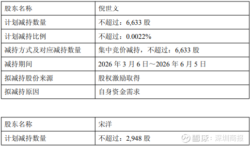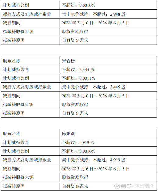 倪世文拟减持数量不超过6633股,占公司总股本的比例不超过0.0022%;宋洋拟减持数量不超过2948股,占公司总股本的比例不超过0.0010%;宋岩松拟减持数量不超过3445股,占公司总股本的比例不超过0.0011%;陈悉遥拟减持数量不超过4919股,占公司总股本的比例不超过0.0016%。