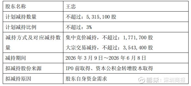 公告显示,本次减持计划集中竞价方式减持不超过177.17万股(占公司总股本1%),通过大宗交易方式减持不超过354.34万股(占公司总股本2%)。减持期间为2026年3月9日至2026年6月8日。目前,第二大股东王忠先生持有公司股份40,644,500股,占公司股份总数的22.94%。