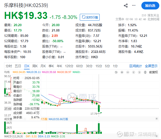 福建乐摩物联科技股份有限公司(简称乐摩科技,2539)2月5日股价单日暴跌39.77%,公司收盘价为21.08港元/股,以收盘价计算,公司市值为11.71亿港元。