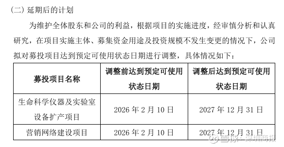 关于“生命科学仪器及实验室设备扩产项目”延期原因,公司称因本项目落位于厂房内实施,项目推进进度、实际建设周期及验收审批等各环节耗时均超出公司原有预期。该募投项目项下厂房已完成主体建筑工程的全部建设工作,各类主体结构、房屋楼栋均已施工完毕并达到完工状态。但受厂区周边市政水务管道铺设尚未完成,导致厂区消防验收尚不具备客观条件。公司正持续与市政建设相关主管部门及施工单位保持密切沟通与积极协 调,待相关配套工程完成并实现顺利接驳后,将立即启动厂房后续消防验收等各项工作,全力推进募投项目尽快达到预定可使用状态。