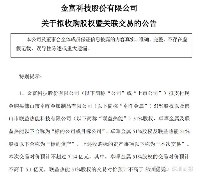 公告介绍,公司拟支付现金购买佛山市卓晖金属制品有限公司(以下简称“卓晖金属”)51%股权以及佛山市联益热能科技有限公司(以下简称“联益热能”)51%股权,卓晖金属及联益热能以下合称为“标的公司或目标公司”,卓晖金属51%股权及联益热能51%股权以下合称为“标的资产”,上述收购标的资产事项以下称为“本次交易”。本次交易对价预计不超过7.14亿元,其中,卓晖金属51%股权的交易对价预计不高于5.1亿元,联益热能51%股权的交易对价预计不高于2.04亿元。