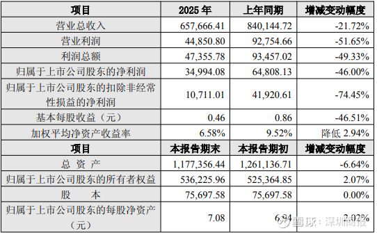 2月6日,昆药集团(600422)发布的2025年度业绩快报显示,公司报告期内实现营业总收入65.77亿元,同比下降21.72%;归属于上市公司股东的净利润3.5亿元,同比下降46%;基本每股收益0.46元。