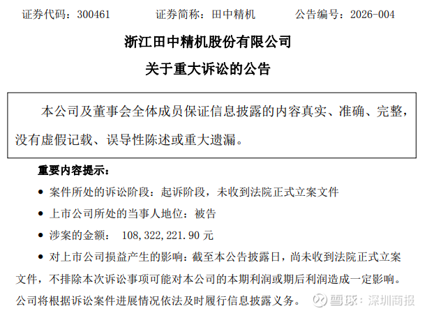 至于本次诉讼案件对公司本期利润或期后利润等的影响,田中精机称,截至公告披露日,公司及合并报表范围内子公司生产经营一切正常。公司尚未收到正式立案文件,后续法院是否受理存在不确定性,暂时无法评估对公司本期利润或期后利润的影响。