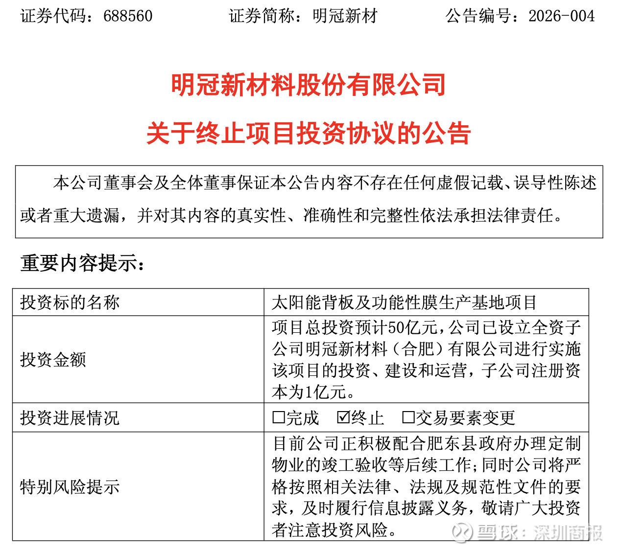 对于终止原因,明冠新材称,自2023年第四季度起,光伏行业已出现产能过剩苗头,产业链产品价格竞争随之加剧,行业处于产业调整周期,2024年和2025年度出现光伏行业普遍亏损。