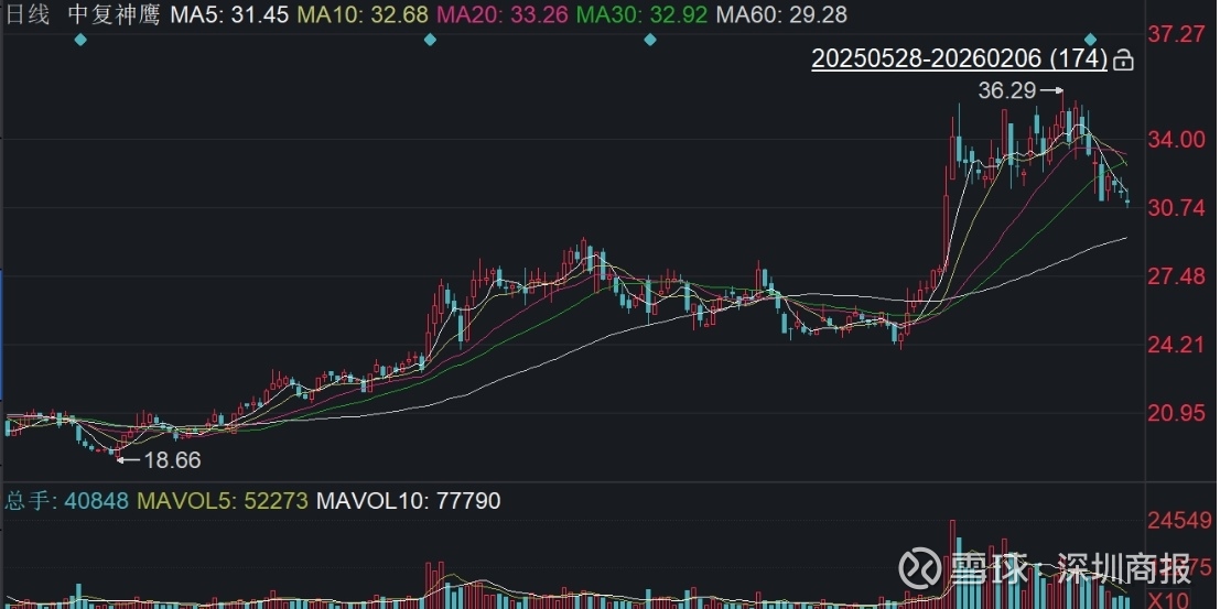 二级市场上,截至2月6日收盘,中复神鹰下跌1.62%报30.90元/股,总市值约278.10亿元,近一年来公司股价累计上涨约67%。