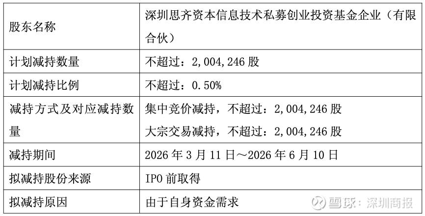 股东深圳思齐持有公司股份25,000,972股,占公司总股本的6.24%。上述股份来源于公司首次公开发行前持有的股份,并于2022年11月14日起上市流通。由于自身资金需求,深圳思齐将根据市场情况拟通过集中竞价或大宗交易方式减持其所持有的公司股份合计不超过2,004,246股,拟减持股份数量占公司总股本的比例合计不超过0.50%。