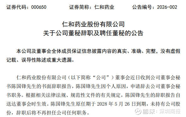 2月9日,仁和药业(000650)发布公告,公司董事会近日收到公司董事会秘书陈国锋的书面辞职报告,陈国锋因个人原因,申请辞去公司董事会秘书职务。