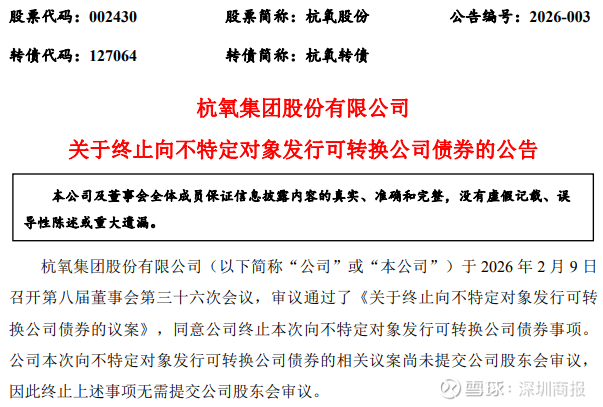2月9日,杭氧股份(002430.SZ)公告,公司于2026年2月9日召开第八届董事会第三十六次会议,审议通过了《关于终止向不特定对象发行可转换公司债券的议案》,同意公司终止本次向不特定对象发行可转换公司债券事项。公司本次向不特定对象发行可转换公司债券的相关议案尚未提交公司股东会审议,因此终止上述事项无需提交公司股东会审议。