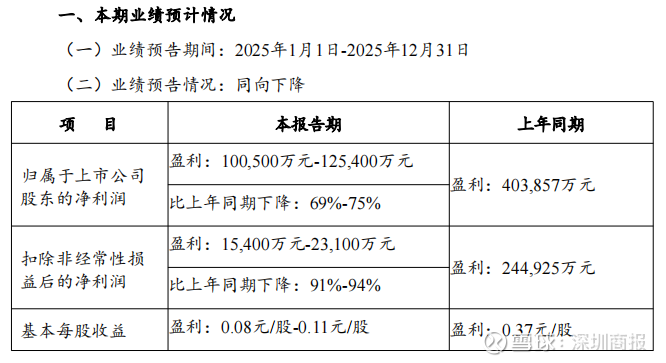 此前,公司于1月31日发布的2025年度业绩预告,预计归母净利润为10.05亿元至12.54亿元,同比大幅下降69%至75%;扣除非经常性损益后的净利润预计在1.54亿元至2.31亿元之间,同比下降91%至94%。