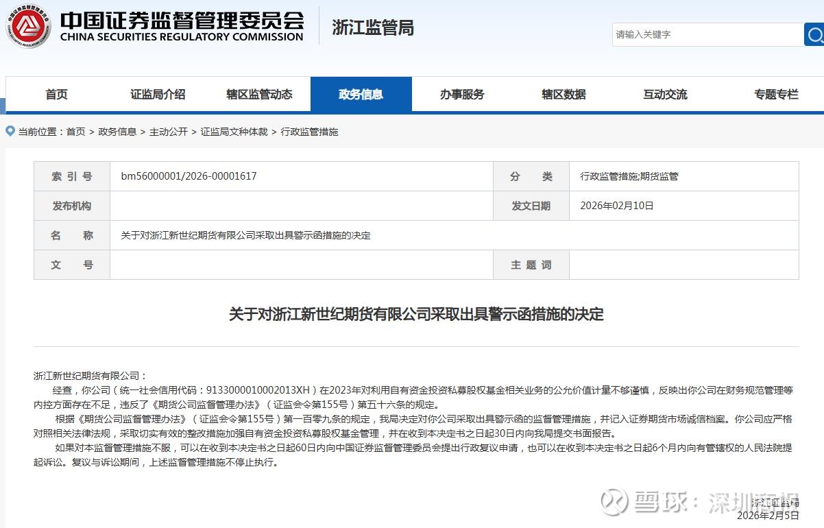 2月10日,浙江证监局官网发布关于对浙江新世纪期货有限公司、公司时任副总经理汪一青采取出具警示函措施的决定。