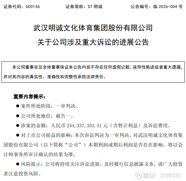2025年8月20日,公司在指定媒体上披露了《武汉明诚文化体育集团股份有限公司关于公司涉及重大诉讼的公告》,原告北京福升投资管理有限公司(以下简称“北京福升”)诉公司虚假陈述致其损失事项,要求公司赔偿损失人民币244,337,353.31元(含暂计利息)及诉讼费用。