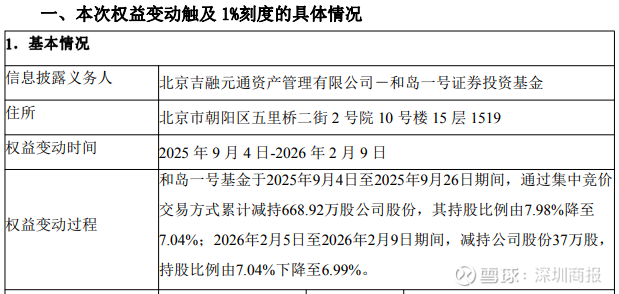 2月10日晚间,獐子岛(002069)发布公告,近日,公司收到持股5%以上股东北京吉融元通资产管理有限公司-和岛一号证券投资基金(以下简称“和岛一号基金”)发来的《关于减持獐子岛股份触及1%刻度的告知函》,和岛一号基金于2025年9月4日至2025年9月26日期间,通过集中竞价交易方式累计减持668.92万股公司股份,其持股比例由7.98%降至7.04%;2026年2月5日至2026年2月9日期间,减持公司股份37万股,减持后该股东持有4971.27万股公司股份,持股比例由7.04%下降至6.99%。