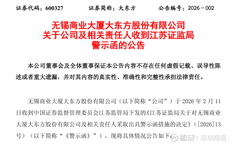 2月11日,大东方(600327)发布公告,公司及财务总监徐文武因违规行为,被采取出具警示函措施。
