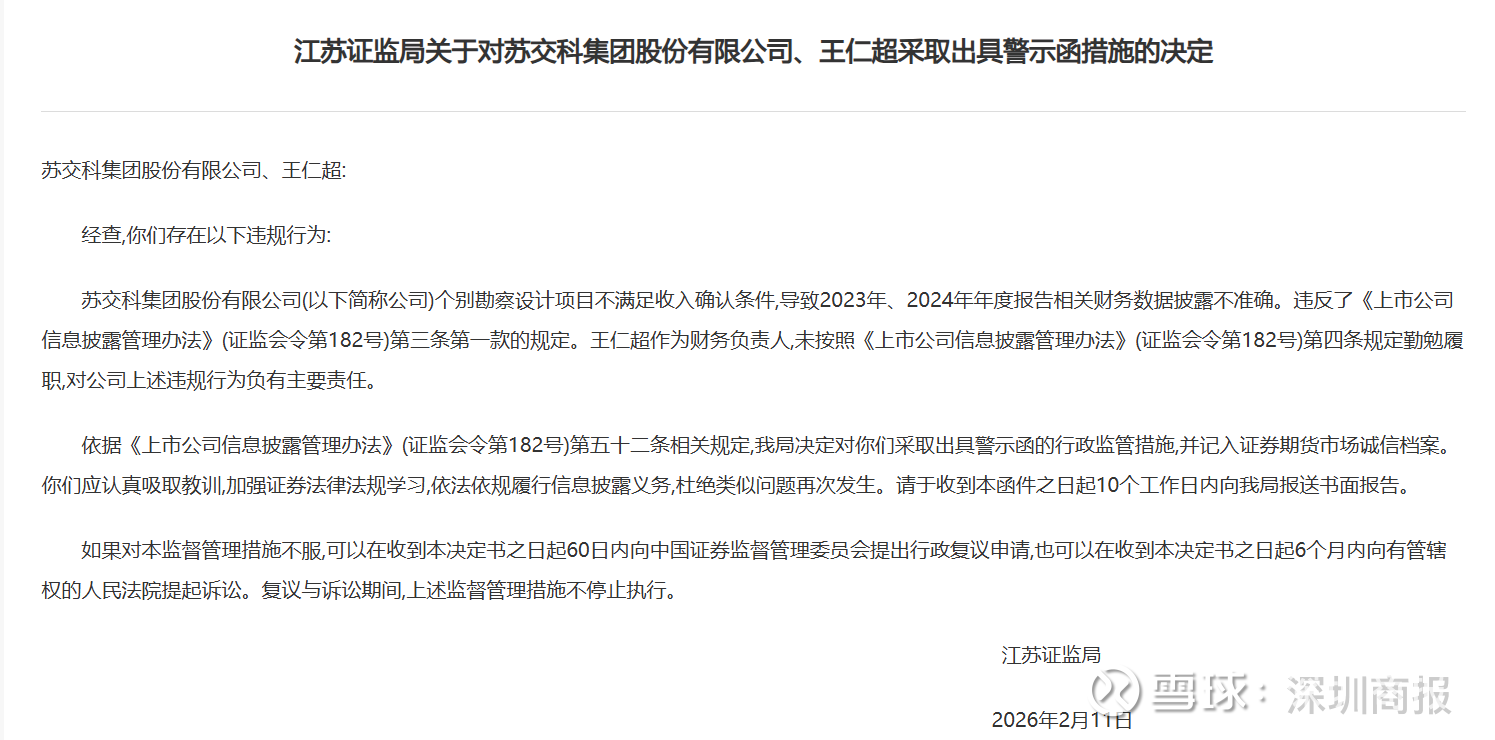 2月11日,根据江苏证监局发布的公告,苏交科(300284)及其财务负责人王仁超因个别勘察设计项目不满足收入确认条件,导致2023及2024年报相关财务数据披露不准确,被采取出具警示函的行政监管措施。