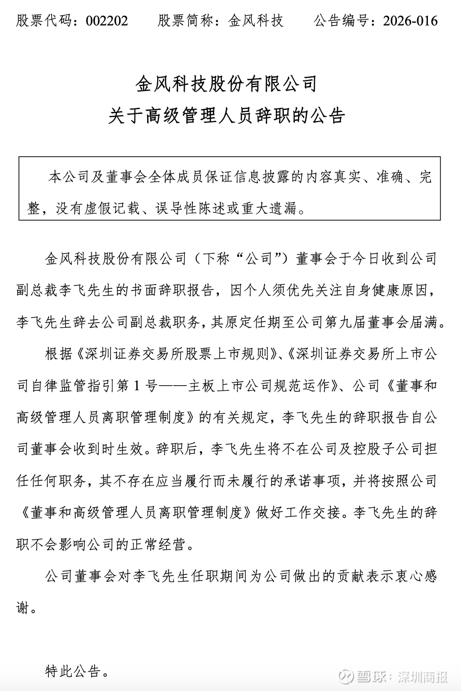 2月11日,金风科技(002202)发布公告,公司董事会于近日收到公司副总裁李飞的书面辞职报告,因个人须优先关注自身健康原因,李飞辞去公司副总裁职务,其原定任期至公司第九届董事会届满。