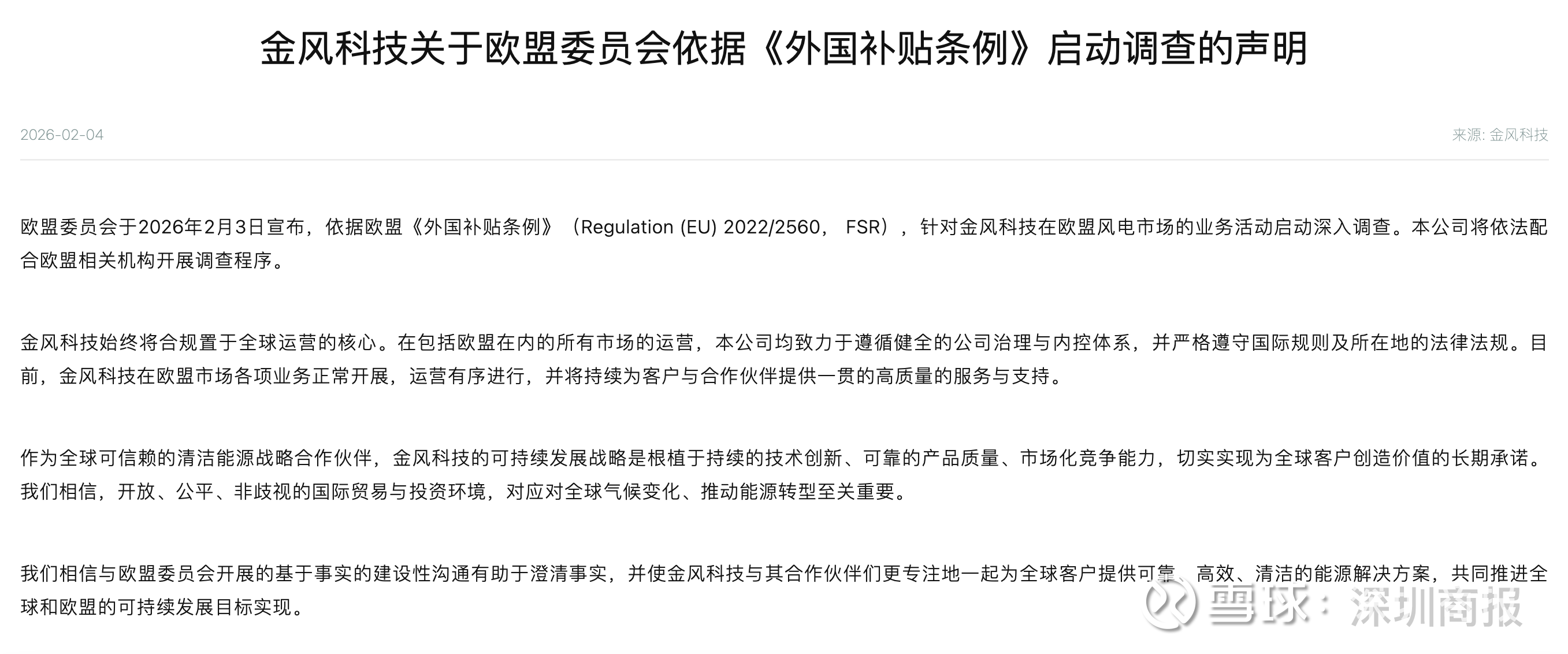 另外,欧盟委员会于2月3日宣布,依据《外国补贴条例》(FSR)对金风科技在欧盟境内的风力发电机组生产、销售及相关服务活动,启动深入调查。
