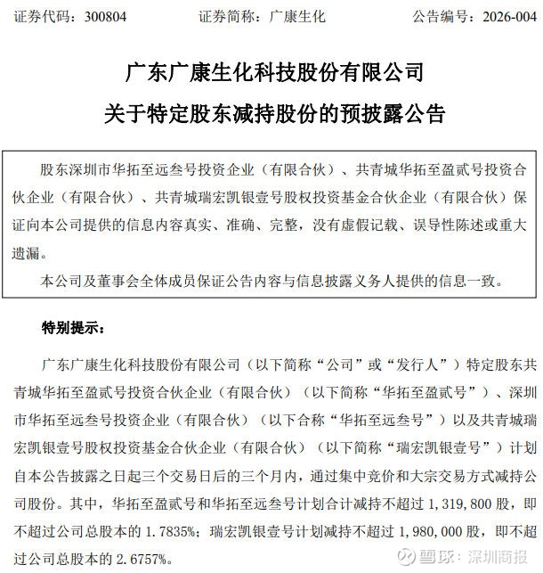 2月11日,广康生化(300804)公告,近日收到华拓至盈贰号、华拓至远叁号及瑞宏凯银壹号出具的《减持计划告知函》。
