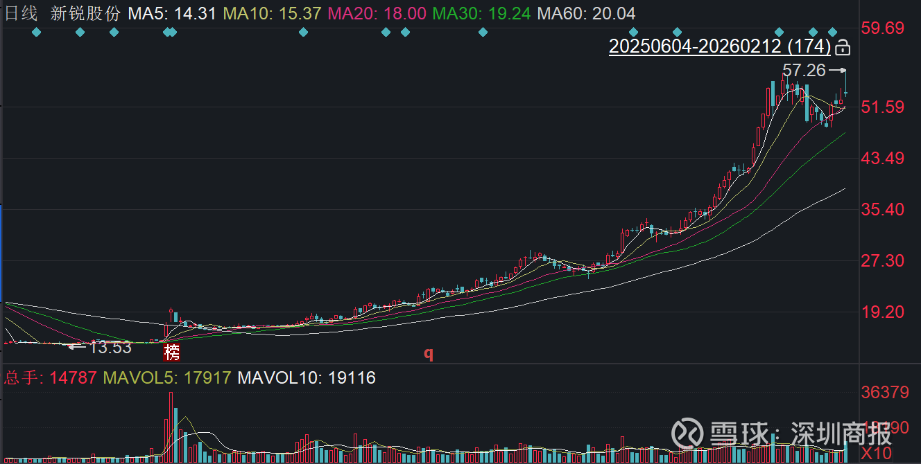 二级市场上,截至2月12日午间收盘,新锐股份上涨2.06%报53.63元/股,总市值约135.37亿元,近一年来公司股价上涨近318%。
