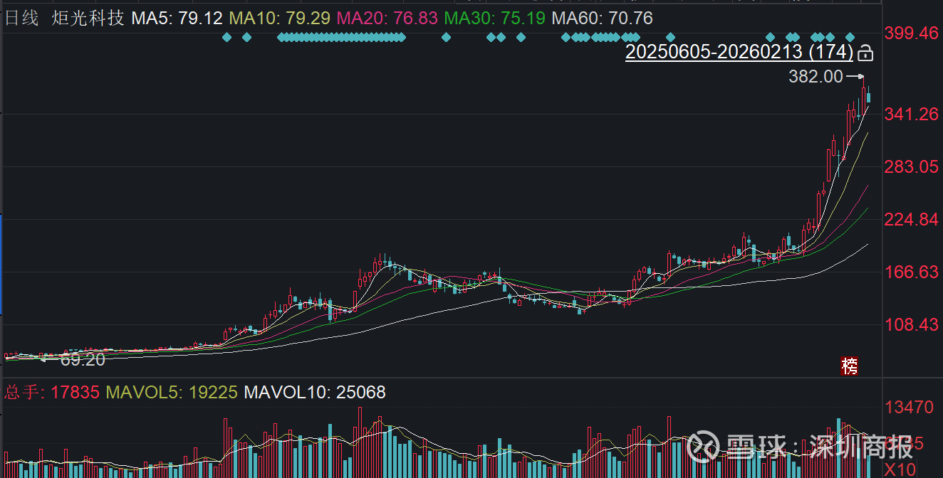 二级市场上,截至2月13日收盘,炬光科技下跌4.49%报353.05元/股,总市值约317.25亿元,近一年来累计上涨380%。