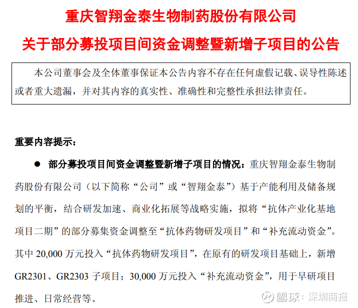 2月13日晚间,科创板公司智翔金泰(688443)发布关于部分募投项目间资金调整暨新增子项目的公告。