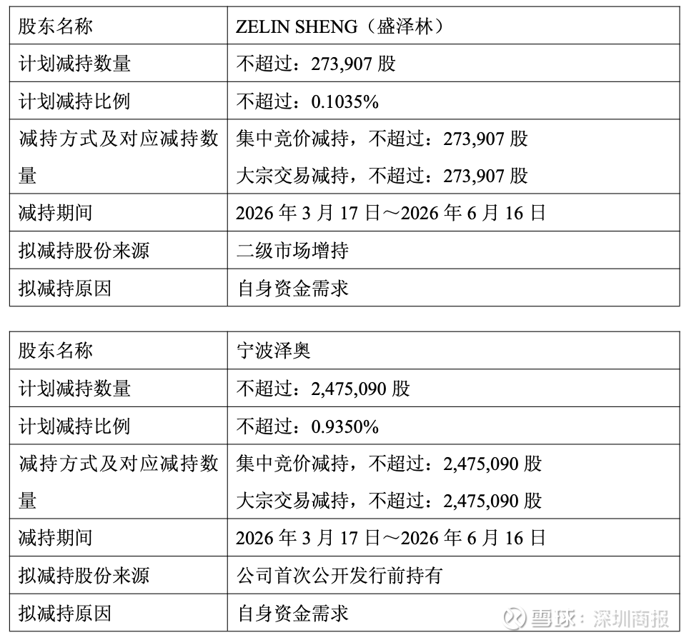 宁波泽奥拟通过集中竞价或大宗交易方式减持公司股份数量不超过247.51万股,即不超过公司总股本的0.9350%。