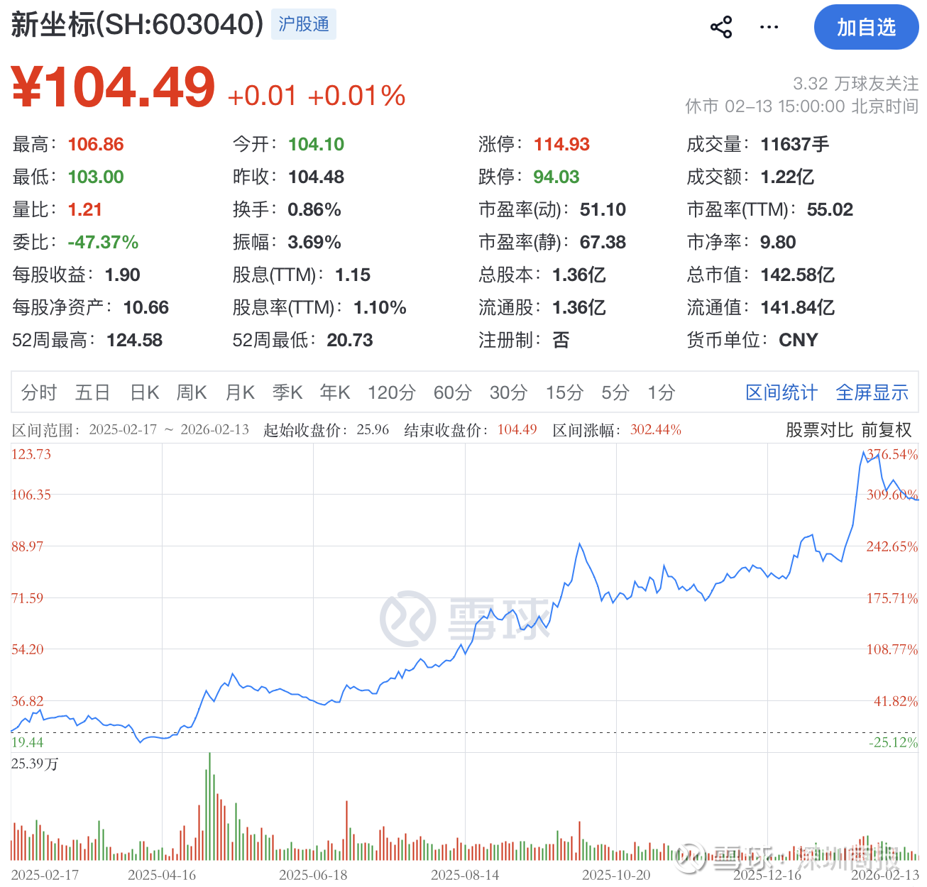 二级市场上,截至2月13日收盘,新坐标上涨0.01%报104.49元/股,总市值为142.58亿元。近一年,公司股价已涨302.44%。