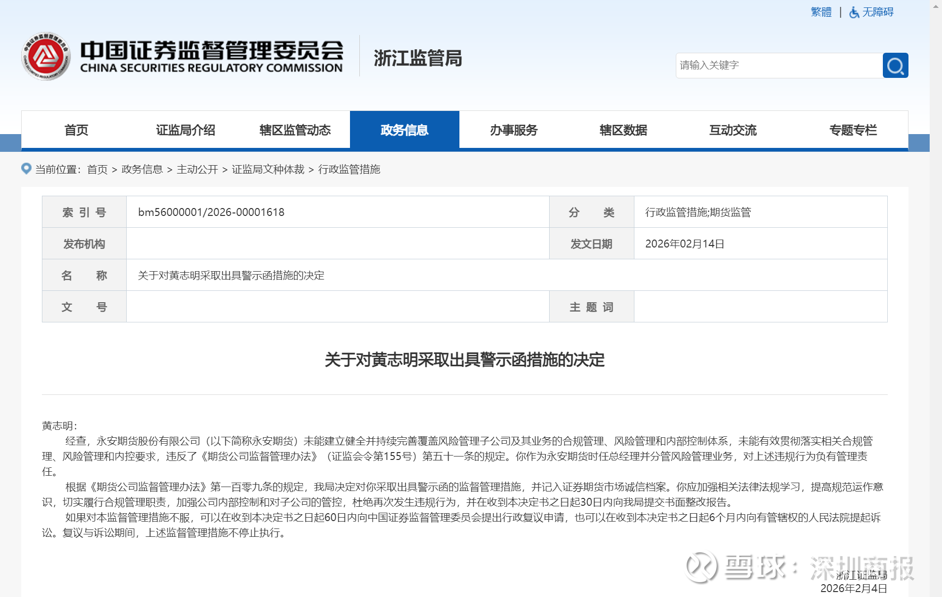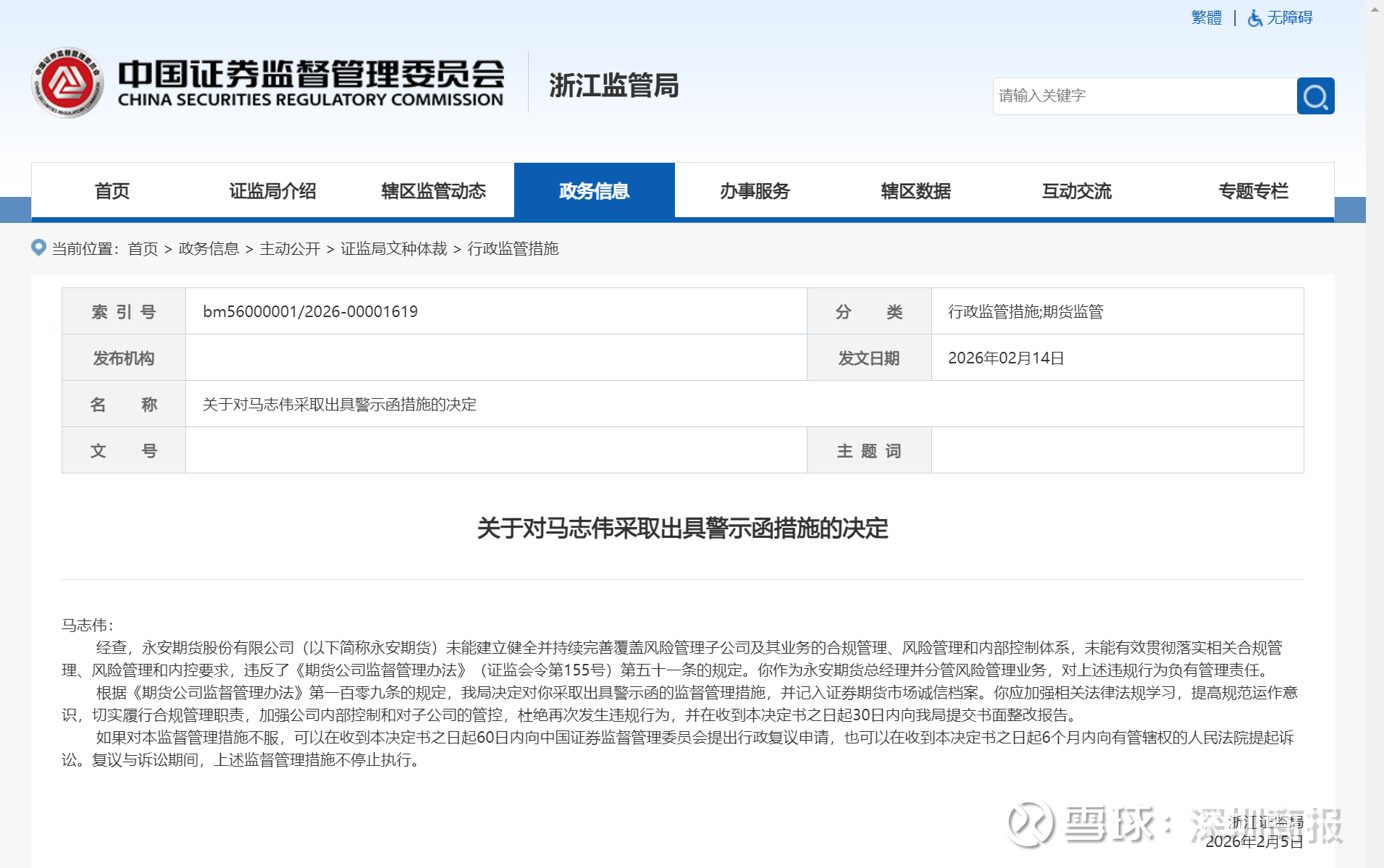 2月14日,浙江证监局官网发布对永安期货股份有限公司(以下简称永安期货)采取责令改正措施的决定。同时,浙江证监局还发布了对相关责任高管马志伟、黄志明、葛国栋采取出具警示函措施的决定。