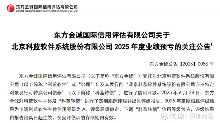 据公告,2025年6月24日,东方金诚对科蓝软件主体及“科蓝转债”进行了定期跟踪评级并出具评级报告,2025年定期跟踪评级结果为下调科蓝软件主体信用等级为A,评级展望稳定,下调“科蓝转债”信用等级为A,评级结果自报告出具日起生效,在受评债项的存续期内有效。