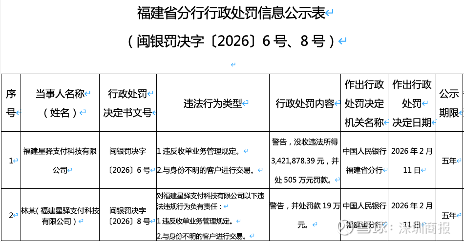 2月13日,中国人民银行福建省分行公布一则行政处罚信息,福建星驿支付科技有限公司(下称“星驿支付”)因违反收单业务管理规定、与身份不明的客户进行交易,被警告、没收违法所得342.19万元,并处505万元罚款。该公司相关责任人林某也被警告,并被处以罚款19万元。