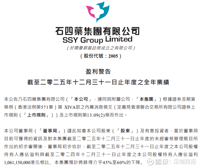 2月16日下午,石四药集团(02005)发布公告,董事局初步估计,截至2025年12月31日止年度的本公司股权持有人应占溢利与截至2024年12月31日止年度的本公司股权持有人应占溢利10.61亿港元相比,本集团预计将取得约45%至60%的下降。